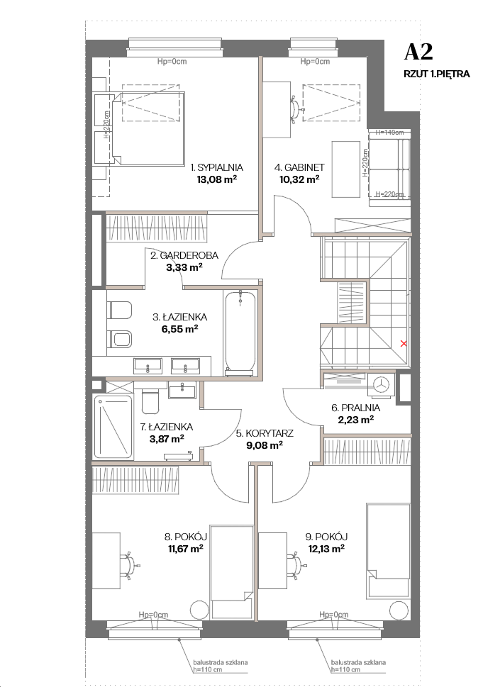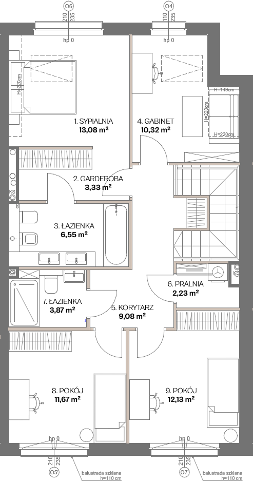 Na piętrze zaprojektowano cztery ustawne pokoje, które mogą pełnić funkcję sypialni, pokoi dziecięcych lub gabinetów – w zależności od potrzeb domowników. Strefa prywatna obejmuje również główną sypialnię (master bedroom) z prywatną łazienką i garderobą, zapewniającą komfort i poczucie prywatności. Dodatkowo na piętrze znajduje się druga łazienka oraz osobne pomieszczenie pralni.