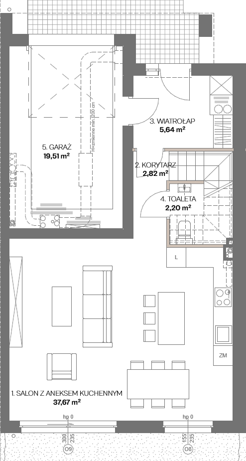 Strefa dzienna obejmuje przestronny salon z jadalnią, otwartą kuchnią i wyjściem do ogrodu. Na parterze znajduje się również łazienka z prysznicem oraz praktyczny wiatrołap. Dodatkowym atutem jest możliwość wejścia do lokalu bezpośrednio z garażu.