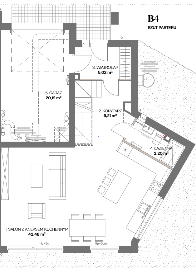 Strefa dzienna składa się z salonu z jadalnią i wyjściem do ogrodu oraz otwartą kuchnią. Na parterze zaprojektowano również dwie sypialnie oraz łazienkę z prysznicem. Do apartamentu można wejść także bezpośrednio z garażu.