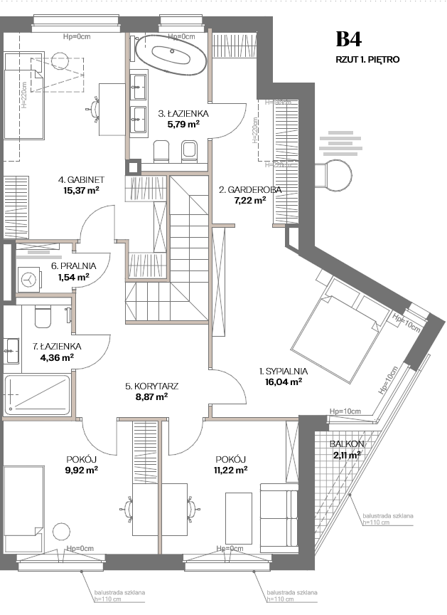 W zaproponowanej aranżacji na piętrze znajduje się główna sypialnia z garderobą oraz łazienka z prysznicem i funkcją pralni. Jest tu też dodatkowy pokój, przeznaczony np. na gabinet. Z antresoli rozciąga się widok na ogród i las.