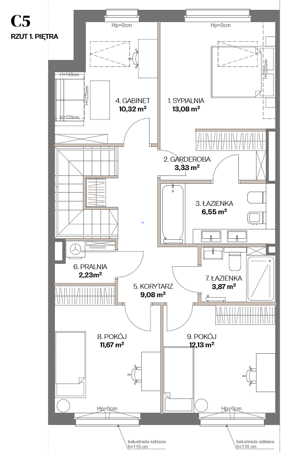 W zaproponowanej aranżacji na piętrze znajduje się główna sypialnia z garderobą oraz łazienka z prysznicem i funkcją pralni. Jest tu też dodatkowy pokój, przeznaczony np. na gabinet. Z antresoli rozciąga się widok na ogród i las.