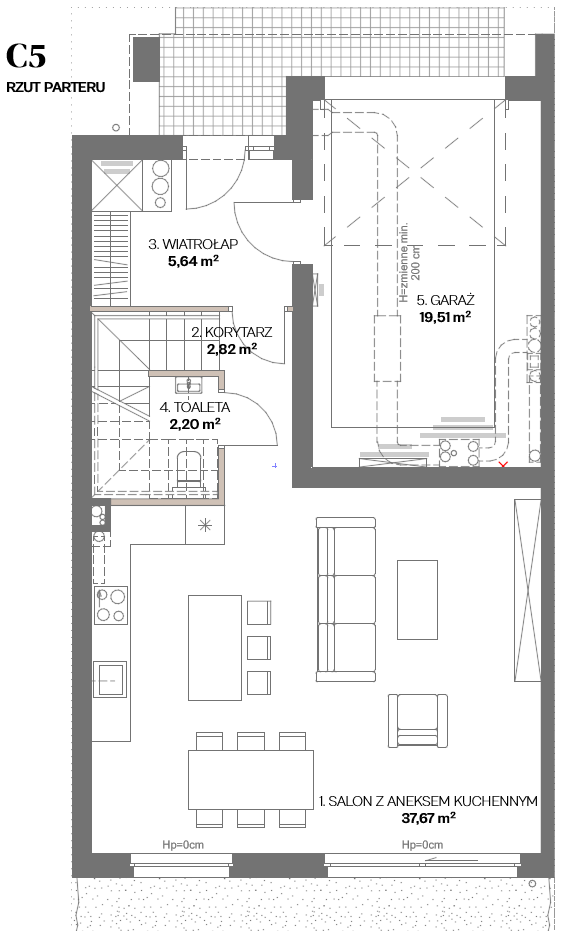 Strefa dzienna składa się z salonu z jadalnią i wyjściem do ogrodu oraz otwartą kuchnią. Na parterze zaprojektowano również dwie sypialnie oraz łazienkę z prysznicem. Do apartamentu można wejść także bezpośrednio z garażu.