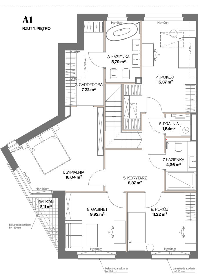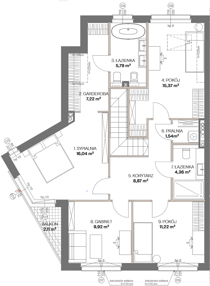 Na piętrze zaprojektowano cztery ustawne pokoje, które mogą pełnić funkcję sypialni, pokoi dziecięcych lub gabinetów – w zależności od potrzeb domowników. Strefa prywatna obejmuje również główną sypialnię (master bedroom) z prywatną łazienką i garderobą, zapewniającą komfort i poczucie prywatności. Dodatkowo na piętrze znajduje się druga łazienka oraz osobne pomieszczenie pralni.
