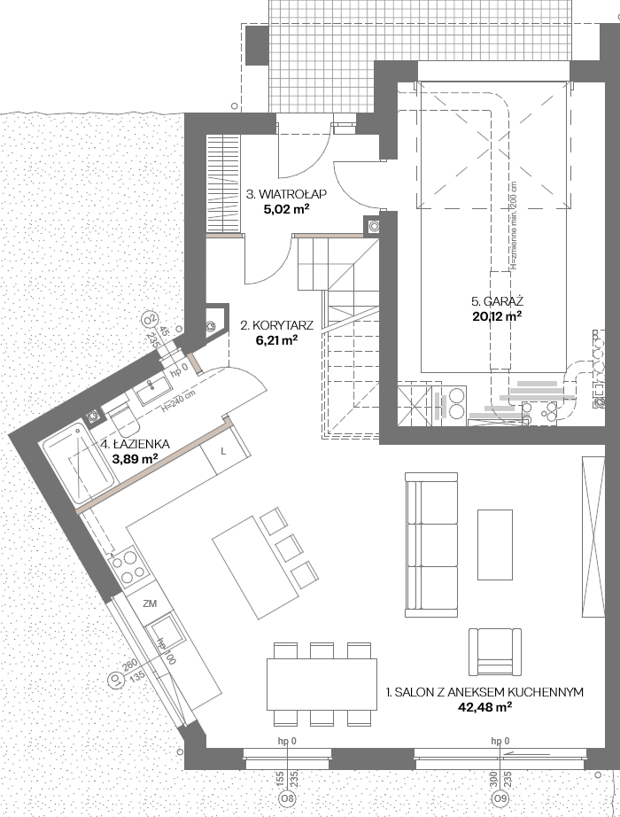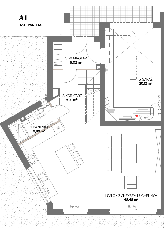Strefa dzienna obejmuje przestronny salon z jadalnią, otwartą kuchnią i wyjściem do ogrodu. Na parterze znajduje się również łazienka z prysznicem oraz praktyczny wiatrołap. Dodatkowym atutem jest możliwość wejścia do lokalu bezpośrednio z garażu.