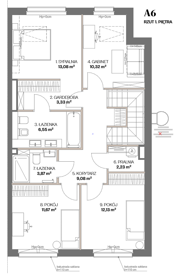 W zaproponowanej aranżacji na piętrze znajduje się główna sypialnia z garderobą oraz łazienka z prysznicem i funkcją pralni. Jest tu też dodatkowy pokój, przeznaczony np. na gabinet. Z antresoli rozciąga się widok na ogród i las.
