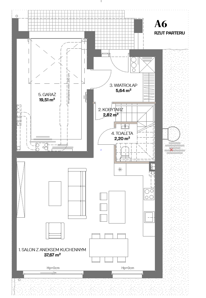 Strefa dzienna składa się z salonu z jadalnią i wyjściem do ogrodu oraz otwartą kuchnią. Na parterze zaprojektowano również dwie sypialnie oraz łazienkę z prysznicem. Do apartamentu można wejść także bezpośrednio z garażu.