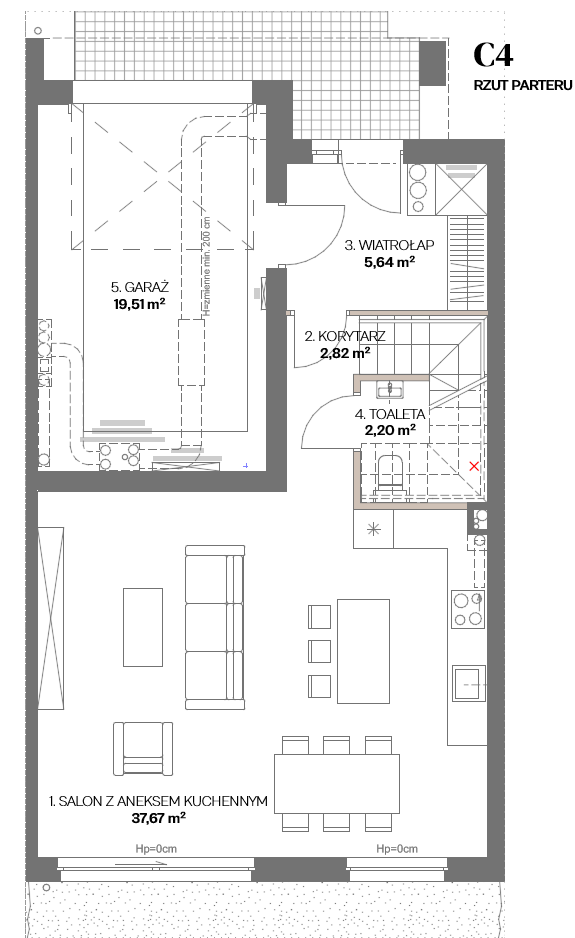 Strefa dzienna składa się z salonu z jadalnią i wyjściem do ogrodu oraz otwartą kuchnią. Na parterze zaprojektowano również dwie sypialnie oraz łazienkę z prysznicem. Do apartamentu można wejść także bezpośrednio z garażu.