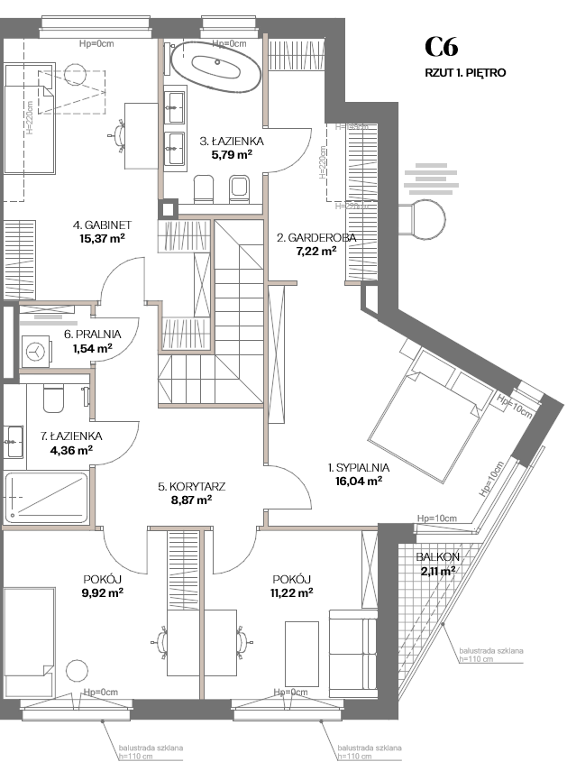 W zaproponowanej aranżacji na piętrze znajduje się główna sypialnia z garderobą oraz łazienka z prysznicem i funkcją pralni. Jest tu też dodatkowy pokój, przeznaczony np. na gabinet. Z antresoli rozciąga się widok na ogród i las.