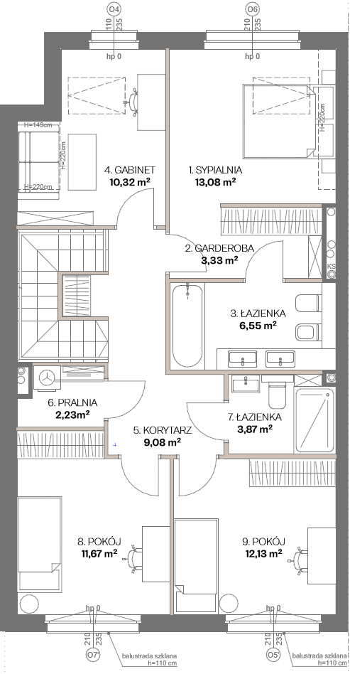 Na piętrze zaprojektowano cztery ustawne pokoje, które mogą pełnić funkcję sypialni, pokoi dziecięcych lub gabinetów – w zależności od potrzeb domowników. Strefa prywatna obejmuje również główną sypialnię (master bedroom) z prywatną łazienką i garderobą, zapewniającą komfort i poczucie prywatności. Dodatkowo na piętrze znajduje się druga łazienka oraz osobne pomieszczenie pralni.