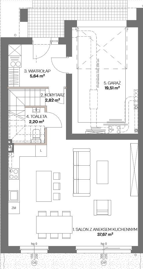 Strefa dzienna obejmuje przestronny salon z jadalnią, otwartą kuchnią i wyjściem do ogrodu. Na parterze znajduje się również łazienka z prysznicem oraz praktyczny wiatrołap. Dodatkowym atutem jest możliwość wejścia do lokalu bezpośrednio z garażu.