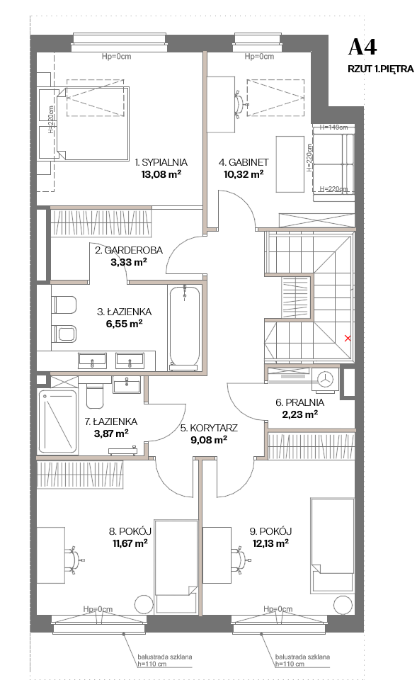 W zaproponowanej aranżacji na piętrze znajduje się główna sypialnia z garderobą oraz łazienka z prysznicem i funkcją pralni. Jest tu też dodatkowy pokój, przeznaczony np. na gabinet. Z antresoli rozciąga się widok na ogród i las.