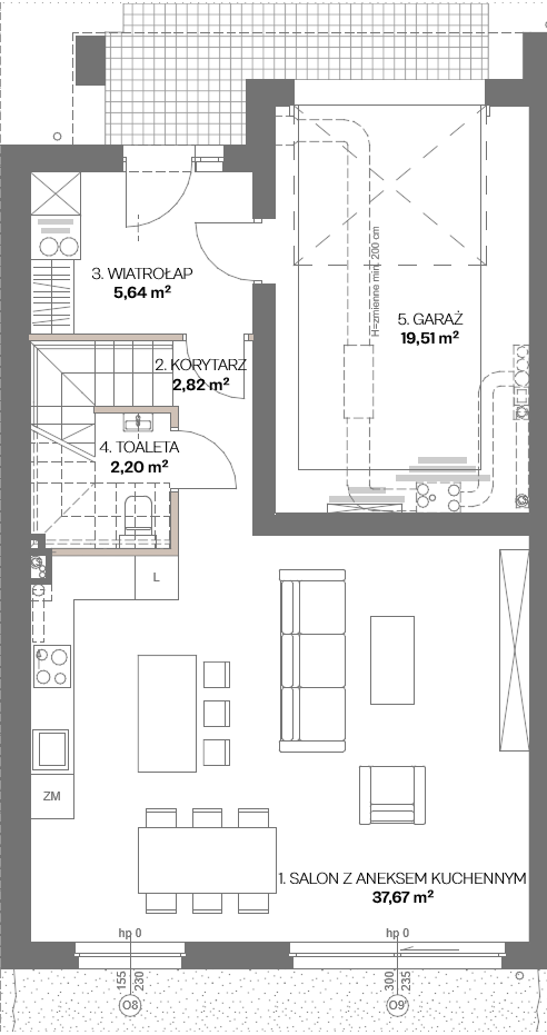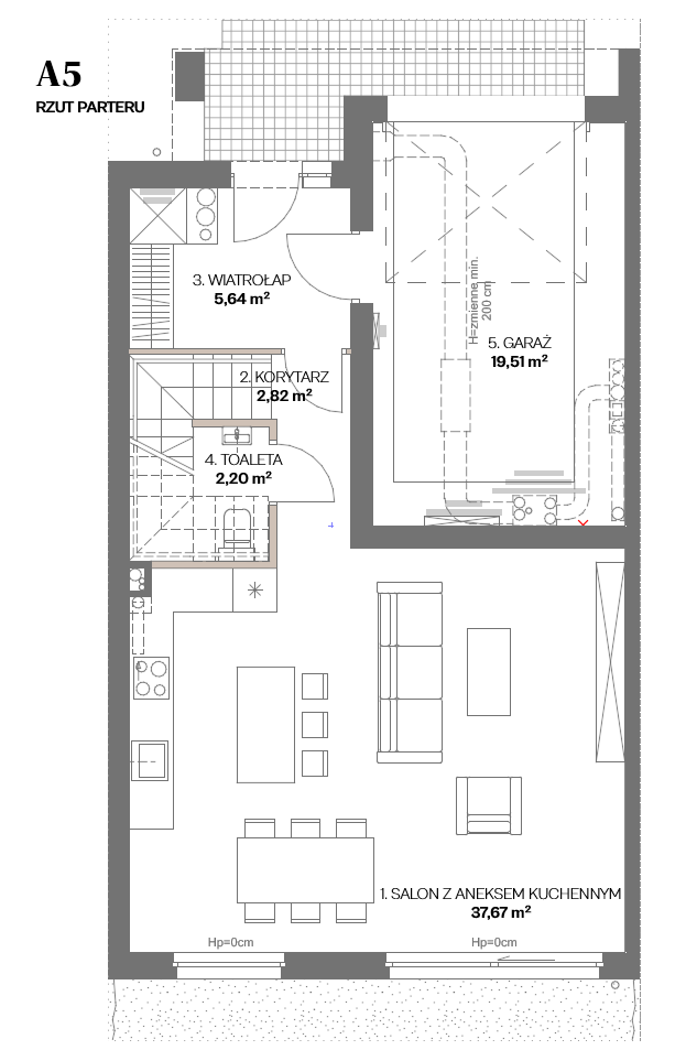Strefa dzienna obejmuje przestronny salon z jadalnią, otwartą kuchnią i wyjściem do ogrodu. Na parterze znajduje się również łazienka z prysznicem oraz praktyczny wiatrołap. Dodatkowym atutem jest możliwość wejścia do lokalu bezpośrednio z garażu.