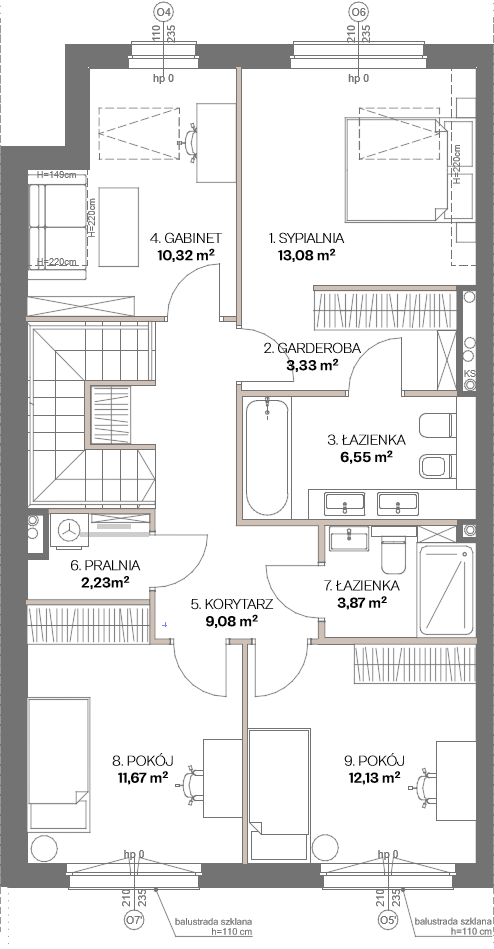 Na piętrze zaprojektowano cztery ustawne pokoje, które mogą pełnić funkcję sypialni, pokoi dziecięcych lub gabinetów – w zależności od potrzeb domowników. Strefa prywatna obejmuje również główną sypialnię (master bedroom) z prywatną łazienką i garderobą, zapewniającą komfort i poczucie prywatności. Dodatkowo na piętrze znajduje się druga łazienka oraz osobne pomieszczenie pralni.